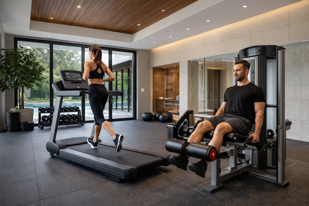 Network connectivity throughout anticipates equipment placement. Power planning requires 8 to 12 dedicated circuits in a 600-square-foot space versus 2 to 3 for similar living space – each motorized cardio equipment needs dedicated 20-amp circuits.