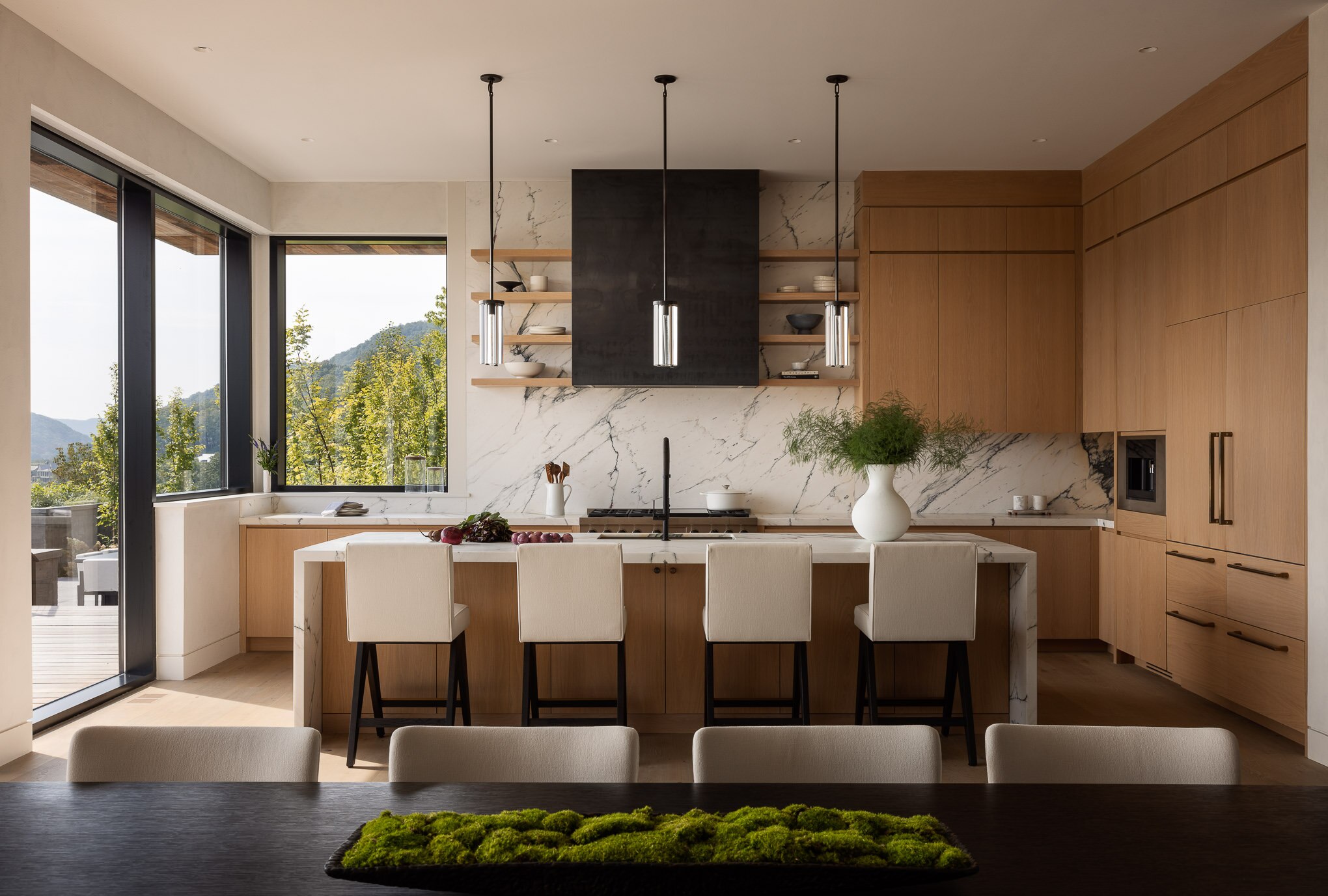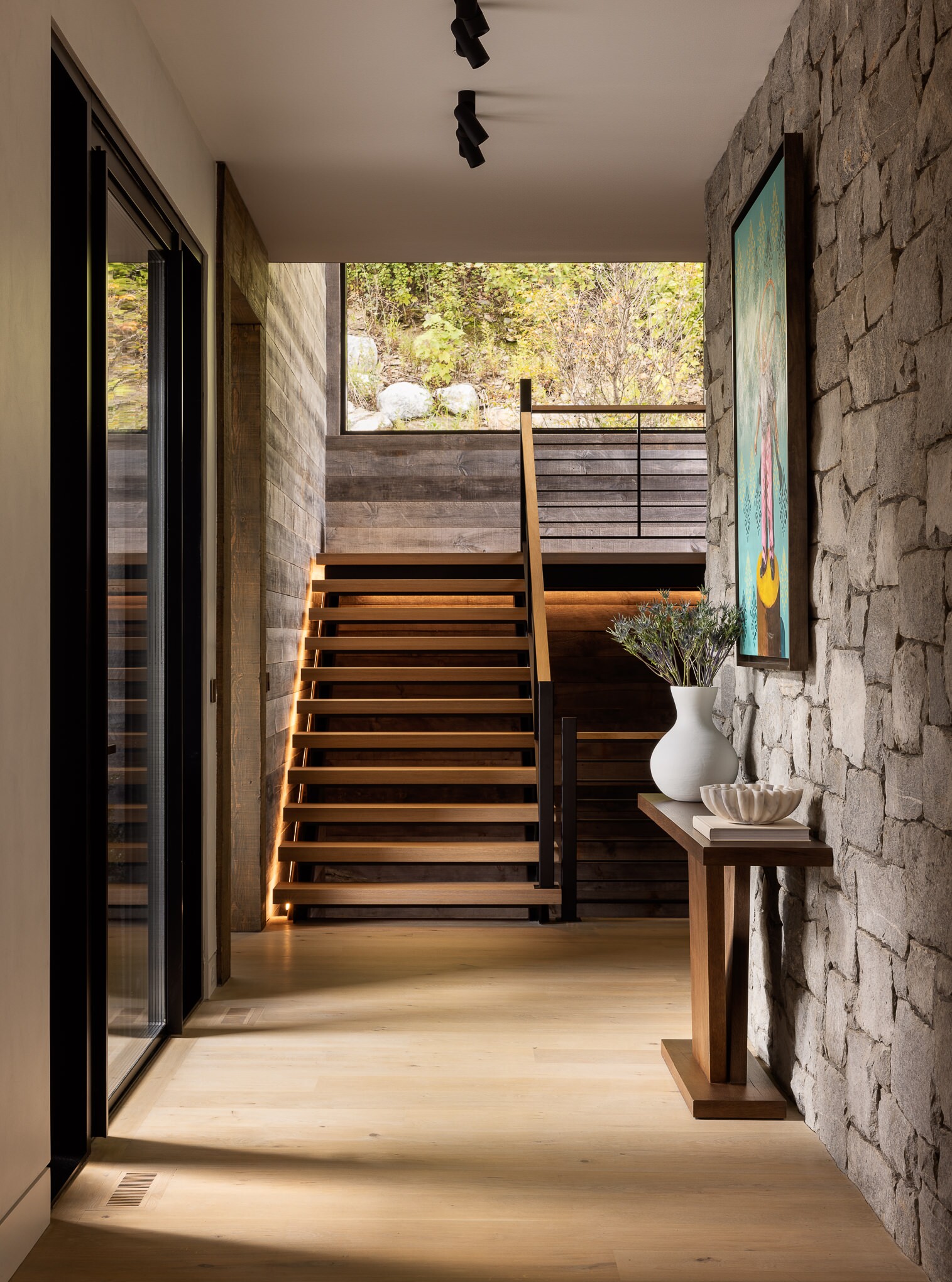 Inspired by the raw beauty of its setting, Alpine is crafted from a palette of concrete, steel, glass, and wood—materials chosen for both their permanence and natural harmony. The home’s street-facing façade is intentionally opaque, ensuring privacy, while the rear opens entirely to sweeping valley views. Designed to follow the land’s natural contours, a central stairwell doubles as a vertical light well, drawing sunlight deep into the lower-level living spaces. A skylight above enhances this effect, creating an interplay of light and shadow that shifts throughout the day while maintaining a sense of seclusion within the primary living areas.