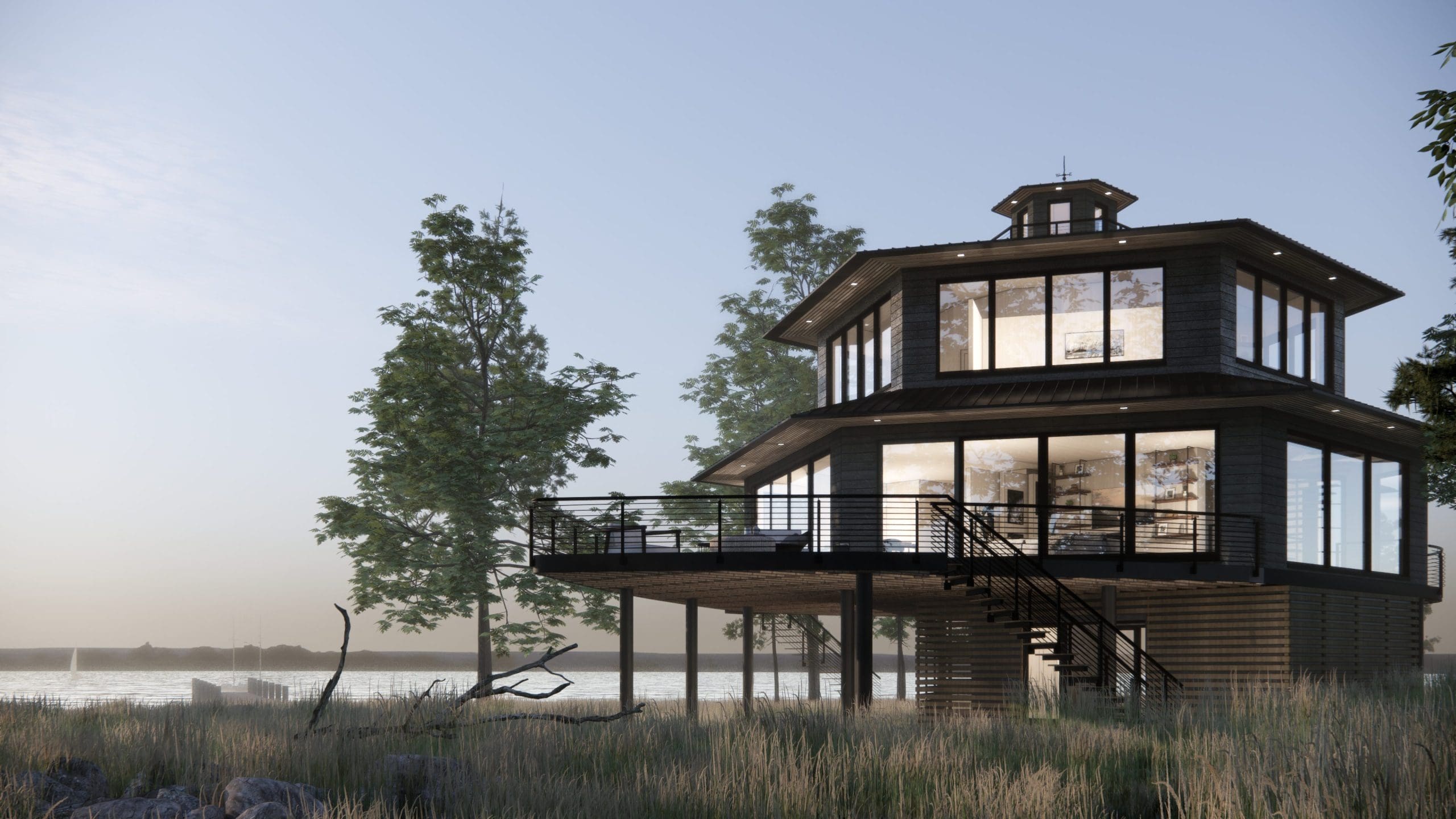 This watershed peninsula retreat takes inspiration from historical Chesapeake Bay lighthouses. Elevated on piles, it pays homage to the conventional lighthouse typology while its charred Shou Sugi Ban wood siding imparts a modern twist, blending the dark, stealthy structure with the shade of the tree canopy. To further accentuate its natural setting, the lifted structure floats above the site ensuring the preservation of native grasses and fauna, while helping the architecture recede into the landscape.