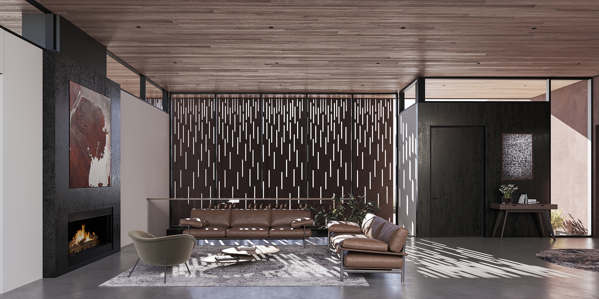 The home is both modest and intriguing when approached. Steel, concrete, and wood comprise the three primary building materials – each explored with a measure of geometric scaling. From afar, they convey their tonality, sheen, and weight, representing themselves in an honest, almost simple, light. When inspected up close you engage the deliberate porosity, vertical geometric expressions, and modular paneling that breaks down their scale and brings lightness to these otherwise weighty materials.